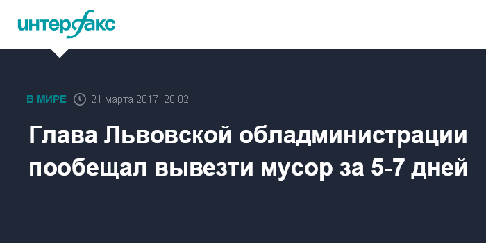 Москва. 21 марта. INTERFAX.RU - Твердые бытовые отходы из Львова будут вывезены в ближайшие 5-7 дней, заявил во вторник глава Львовской областной государственной администрации Олег Синютка.