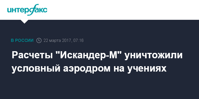 Москва. 22 марта. INTERFAX.RU - Боевые расчеты ракетного соединения Центрального военного округа (ЦВО), оснащенного оперативно-тактическими ракетными комплексами "Искандер-М", групповыми пусками уничтожили условный аэродром противника на учениях в Оренбургской области, сообщает в среду пресс-служба ЦВО.