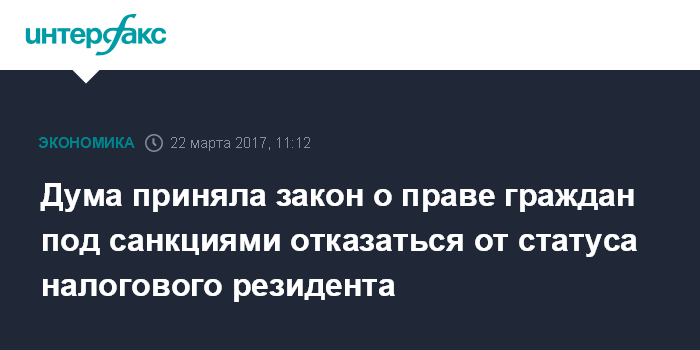 Москва. 22 марта. INTERFAX.RU - Госдума на заседании в среду приняла в третьем чтении закон, который позволит физлицам, находящимся под санкциями, подавать заявления о непризнании себя налоговыми резидентами РФ, если они являются налоговыми резидентами иностранного государства.