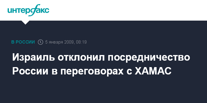 Москва. 5 января. ИНТЕРФАКС - Израиль отклонил предложенное Россией посредничество в контактах с палестинским движением для прекращения огня в секторе Газа, сообщает телеканал "Вести 24" со ссылкой на израильскую газету "Гаарец".