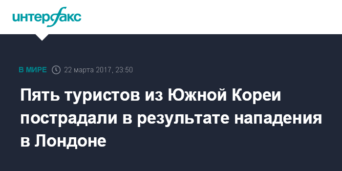 Москва. 22 марта. INTERFAX.RU - Пять туристов из Южной Кореи получили различные ранения в ходе нападения в среду в Лондоне, сообщили южнокорейские СМИ.