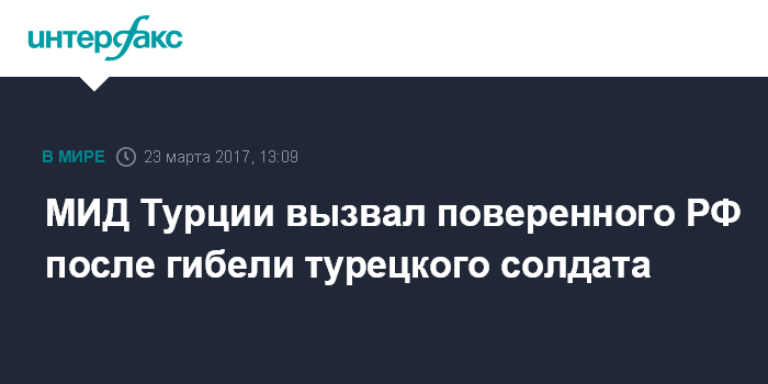 Москва. 23 марта. INTERFAX.RU - МИД Турции вызвал временного поверенного посольства РФ в Анкаре Сергея Панова в связи с обстрелом, который велся с сирийской территории и привел к гибели турецкого военного.