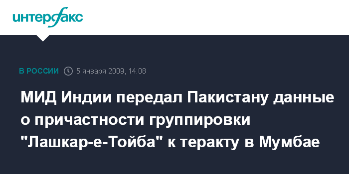 Москва. 5 января. INTERFAX.RU - Индия передала Пакистану свидетельства, указывающие на причастность группировки "Лашкар-и-Тойба", базирующейся в Пакистане, к террористической атаке в Мумбаи, и требует от пакистанской стороны действий против террористов, сообщает британская телерадиокорпорация Би-би-си со ссылкой на заявление министра иностранных дел Индии Пранаба Мукерджи.
