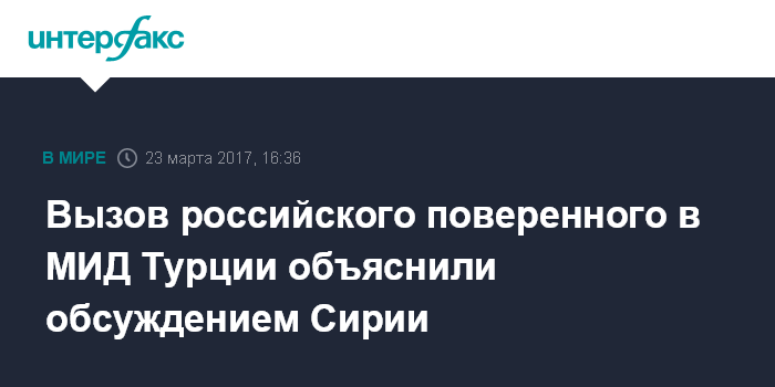 Москва. 23 марта. INTERFAX.RU - Временный поверенный в делах РФ в Турции Сергей Панов был вызван в турецкий МИД, чтобы обсудить сирийское урегулирование, заявила официальный представитель МИД РФ Мария Захарова.