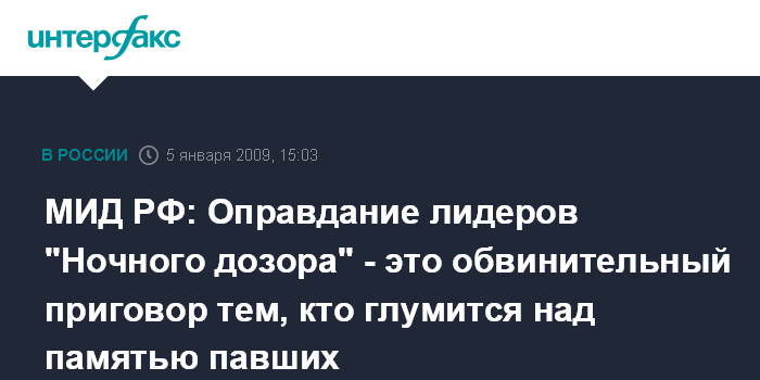 МИД РФ: Оправдание лидеров "Ночного дозора" - это обвинительный приговор тем, кто глумится над памятью павших