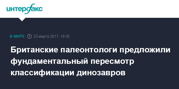 Москва. 23 марта. INTERFAX.RU - Исследователи из Великобритании предложили фундаментально пересмотреть филогенетическое дерево, а значит, и научную классификацию динозавров. Основанием тому послужил масштабный анализ окаменелостей, пишет сайт N+1 со ссылкой на журнал Nature.