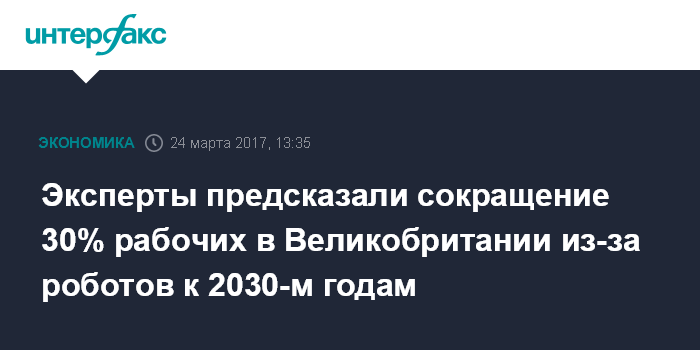 Москва. 24 марта. INTERFAX.RU - Более 10 млн трудящихся Великобритании рискуют потерять работу в ближайшие 15 лет из-за автоматизации производства и предоставления услуг - 30% рабочих мест в стране к началу 2030 годов будут занимать роботы, говорится в макроэкономическом прогнозе PwC.