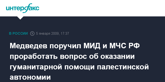 Москва. 5 января. INTERFAX.RU - Президент России Дмитрий Медведев дал поручение министру иностранных дел России Сергею Лаврову и министру по делам гражданской обороны, чрезвычайным ситуациям и ликвидации последствии стихийных бедствий Сергею Шойгу "срочно проработать вопрос об оказании дополнительной гуманитарной помощи Палестинской национальной автономии".