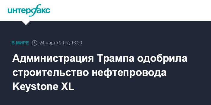 Москва. 24 марта. INTERFAX.RU - Администрация президента США Дональда Трампа дала разрешение на строительство нефтепровода Keystone XL. Об этом сообщает "Би-би-си".