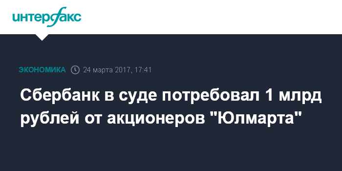 Москва. 24 марта. INTERFAX.RU - Сбербанк подал в Дзержинский районный суд Петербурга иск о взыскании убытков по кредитному договору с акционеров "Юлмарта" и бывшего топ-менеджера ритейлера, следует из материалов суда. Иск подан к акционерам ритейлера Дмитрию Костыгину, Августу Мейеру и Михаилу Васинкевичу, а также к экс-гендиректору НАО "Юлмарт" Сергею Федоринову. Сумма исковых требований в материалах не уточняется.