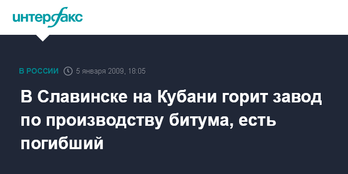 Москва. 5 января. INTERFAX.RU - Пожар произошел в понедельник на заводе по производству битума в городе Славинске на Кубани (Краснодарский край), сообщили агентству "Интерфакс-Юг" в правоохранительных органах города.