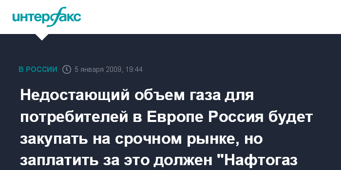 Ново-Огарево. 5 января. ИНТЕРФАКС - Россия будет делать все, чтобы компенсировать недостающий объем газа для Западной Европы и, в частности, намерена закупать газ на срочном рынке, заявил глава "Газпрома" Алексей Миллер.
