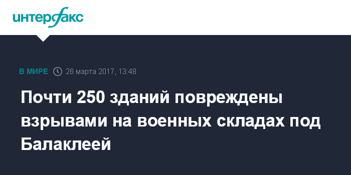 Москва. 26 марта. INTERFAX.RU - В Балаклее (Харьковская область Украины) зафиксированы повреждения 243 зданий в результате начавшегося в ночь на 23 марта пожара с последующей детонацией боеприпасов на расположенных поблизости артиллерийских складах Минобороны Украины.