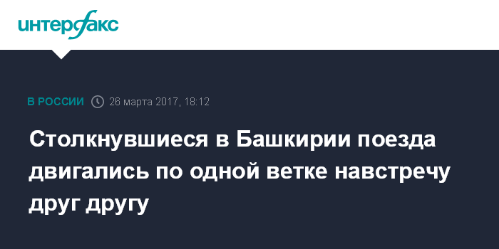 Москва. 26 марта. INTERFAX.RU - Грузовые поезда, столкнувшиеся на территории Учалинского горно-обогатительного комбината в Башкирии, двигались по одной ветке, сообщила "Интерфаксу" старший помощник руководителя СУ СКР по Башкирии Светлана Абрамова в воскресенье.