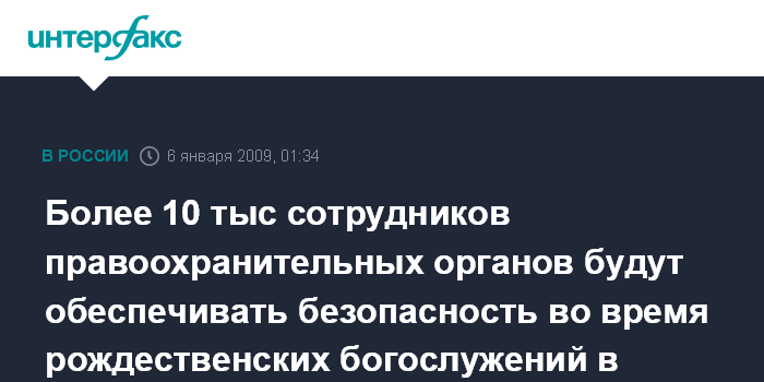 "Как ожидается, в рождественских богослужениях примут участие 3 млн 300 тыс. человек. В охране общественного порядка и безопасности будет задействовано более 10 тыс. сотрудников правоохранительных органов - 8 тыс. 300 милиционеров и 2 тыс. 600 военнослужащих Внутренних войск МВД России", - сообщила "Интерфаксу" пресс-секретарь департамента охраны общественного порядка (ДООП) МВД России Ольга Шклярова.