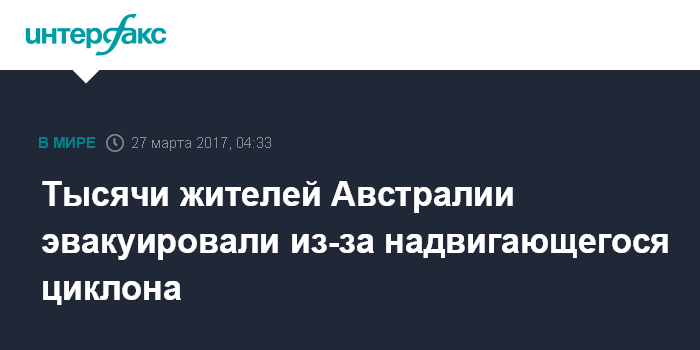 Москва. 27 марта. INTERFAX.RU - Тысячи жителей северо-востока Австралии эвакуированы из-за тропического циклона "Дэбби", который, как ожидается, обрушится на побережье утром во вторник, передает в воскресенье The Australian.