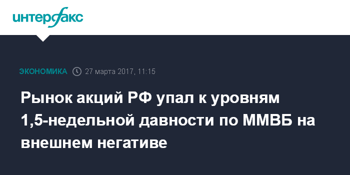 Москва. 27 марта. INTERFAX.RU - Рынок акций РФ утром в понедельник упал к уровняю 1,5-недельной давности по индексу ММВБ на фоне негативной динамики мировых площадок из-за сомнений инвесторов в реформах президента США Дональда Трампа.