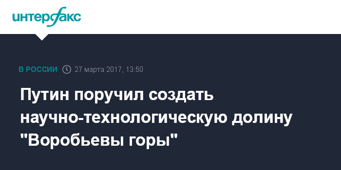 Москва. 27 марта. INTERFAX.RU - Президент РФ Владимир Путин поручил правительству внести в Госдуму и обеспечить до 1 июля 2017 года принятие законопроекта "О научно-технологических долинах", после чего на его основе принять решение о создании научно-технологической долины "Воробьевы горы".