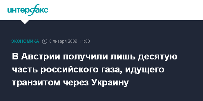 Москва. 6 января. INTERFAX.RU - Лишь 10% от предусмотренных объемов российского газа поступило во вторник утром в Австрию, сообщает австрийский энергетический концерн "О-Эм-Фау".