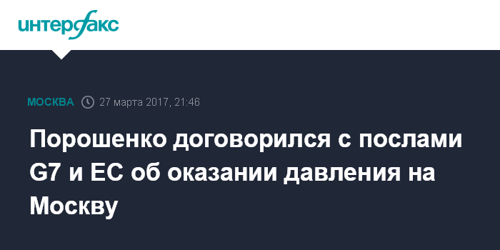 Москва. 27 марта. INTERFAX.RU - Президент Украины Петр Порошенко провел встречу с послами стран "Большой семерки" и Европейского Союза, в ходе которой стороны договорились продолжить оказывать давление на Россию, сообщает пресс-служба главы украинского государства.