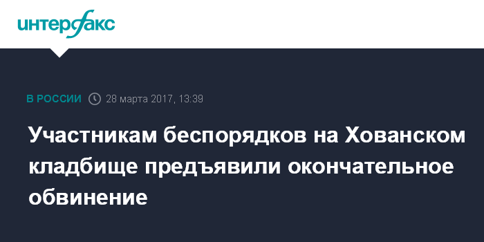 Москва. 28 марта. INTERFAX.RU - Следователи предъявили обвинение в окончательной редакции 16 фигурантам уголовного дела о массовых беспорядках весной прошлого года на Хованском кладбище Москвы, в ходе которых погибло три человека, сообщила официальный представитель Следственного комитета России (СКР) Светлана Петренко.