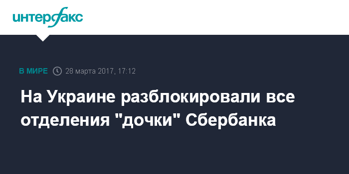 Москва. 28 марта. INTERFAX.RU - Все отделения украинского дочернего банка Сбербанка России уже разблокированы, сообщили в пресс-службе финучреждения.