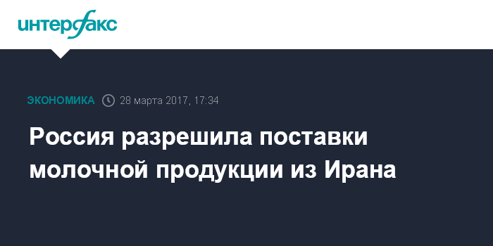 Москва. 28 марта. INTERFAX.RU - Россельхознадзор разрешил поставки молочной продукции из Ирана, сообщается в материалах ведомства.