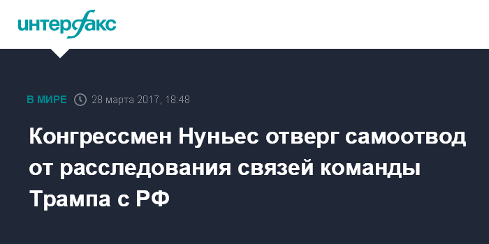 Москва. 28 марта. INTERFAX.RU - Глава комитета по разведке палаты представителей Девин Нуньес заявил, что не намерен самоустраняться от расследования связей между предвыборной командой президента США Дональда Трампа и Россией. Об этом сообщает агентство Associated Press