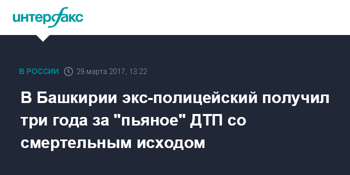Москва. 29 марта. INTERFAX.RU - Суд в Башкирии вынес приговор экс-помощнику оперативного дежурного отдела полиции по Миякинскому району, который в пьяном виде насмерть сбил женщину, сообщила пресс-служба СУ СКР по республике в среду.