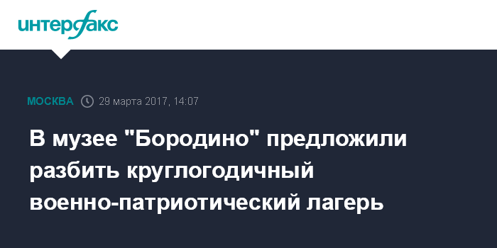 Москва. 29 марта. INTERFAX.RU - В музее-заповеднике "Бородино" может появиться круглогодичный военно-патриотический лагерь, предварительная стоимость первой очереди проекта составит 25 млн рублей. Об этом сообщил в среду директор Государственного Бородинского военно-исторического музея-заповедника Игорь Корнеев.