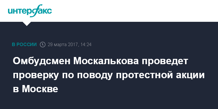 "28 марта уполномоченный по правам человека в РФ Татьяна Москалькова назначила проверку в связи с поступившим обращением исполнительного директора движения "За права человека" Льва Пономарева и председателя Московской Хельсинской группы Людмилы Алексеевой по поводу событий, связанных с шествием 26 марта в Москве", - сообщили "Интерфаксу" в пресс-службе омбудсмена.