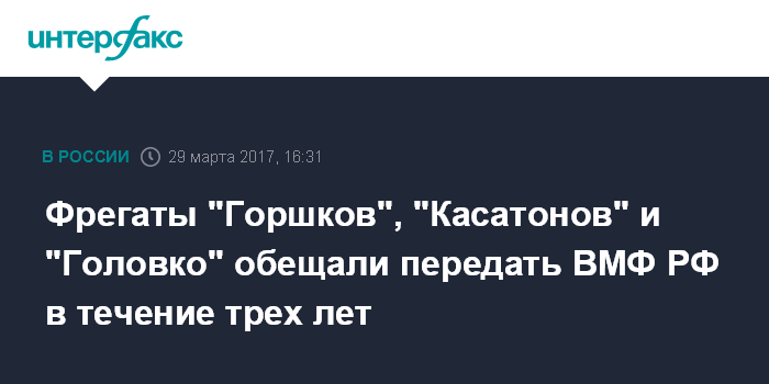 Москва. 29 марта. INTERFAX.RU - АО "Судостроительный завод "Северная верфь" планирует передать ВМФ РФ фрегаты проекта 22350 "Адмирал Горшков", "Адмирал Касатонов" и "Адмирал Головко" в 2017, 2018 и 2019 годах соответственно. Об этом сообщил врио генерального директора судозавода и вице-президент ОСК по военному кораблестроению Игорь Пономарев журналистам в среду в Петербурге.