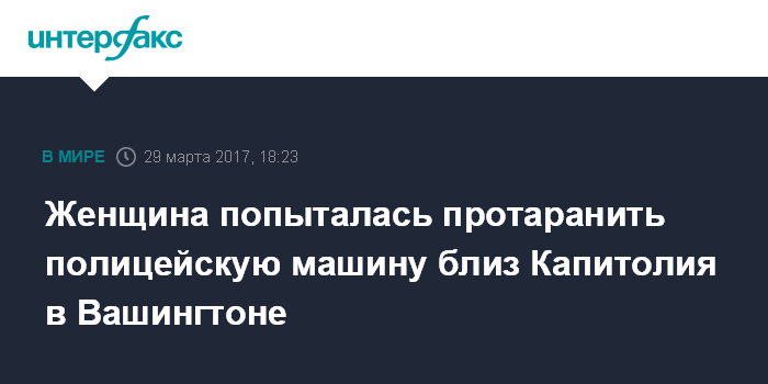 Москва. 29 марта. INTERFAX.RU - В Вашингтоне задержали женщину, попытавшуюся протаранить автомобиль полиции неподалеку от Ботанического сада и Капитолия, сообщает в среду американский телеканал ABC News.