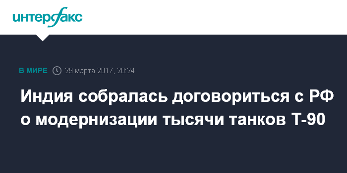 Москва. 29 марта. INTERFAX.RU - Индийские официальные лица ведут переговоры с российской стороной по вопросу о модернизации примерно одной тысячи танков Т-90 вооруженных сил Индии, сообщает газета The Economic Times.