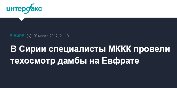 Москва. 29 марта. INTERFAX.RU - Группа инженеров и сотрудники Международного комитета Красного Креста (МККК) провели технический осмотр дамбы в городе Табка на Евфрате, неподалеку от которой располагаются позиции террористической группировки "Исламское государство" (запрещена в РФ), сообщает в среду агентство "Ассошиэйтед пресс".