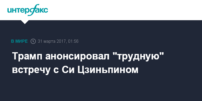 Москва. 31 марта. INTERFAX.RU - Глава США Дональд Трамп предположил, что его встреча с председателем КНР Си Цзиньпином на следующей неделе "будет очень трудной", и посоветовал американским компаниям рассматривать альтернативы китайскому рынку.