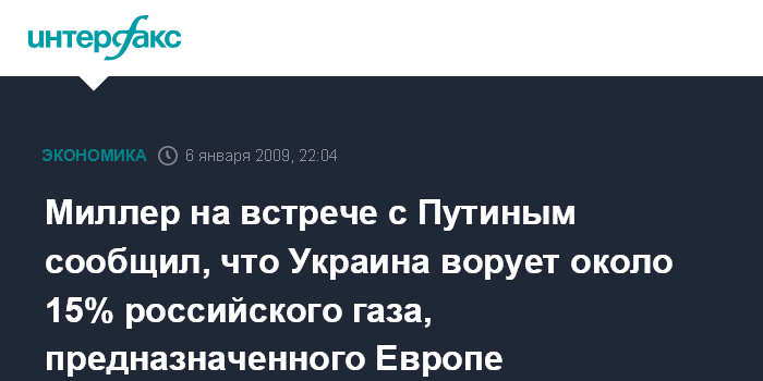Ново-Огарево. 6 января. ИНТЕРФАКС - По последней оперативной информации, Украина ворует около 15% российского газа, который подается на территорию Украины для западных стран, сообщил глава "Газпрома" Алексей Миллер на встрече с премьер-министром РФ Владимиром Путиным.