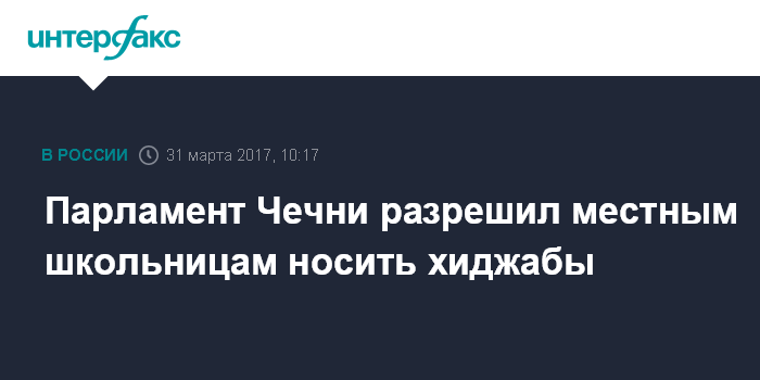 Москва. 31 марта. INTERFAX.RU - Парламент Чеченской Республики принял поправки к закону, разрешающие учащимся носить одежду, которая отражает их религиозные убеждения, сообщается на сайте парламента. Таким образом, школы и вузы, устанавливая требования к форме одежды школьников и студентов, должны будут учитывать право учащихся одеваться согласно народным традициям и религиозным верованиям, например, носить хиджабы.