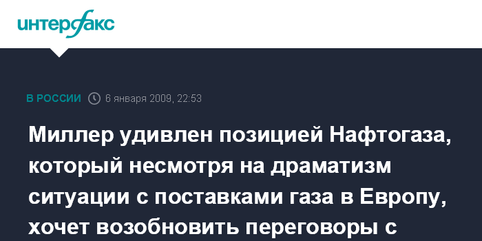 Миллер удивлен позицией Нафтогаза, который несмотря на драматизм ситуации с поставками газа в Европу, хочет возобновить переговоры с Газпромом через два дня