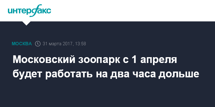 Москва. 31 марта. INTERFAX.RU - Московский зоопарк с 1 апреля перейдет на летний режим работы и будет открыт на два часа дольше - с 9:00 до 20:00. Об этом сообщает пресс-служба департамента культуры Москвы.