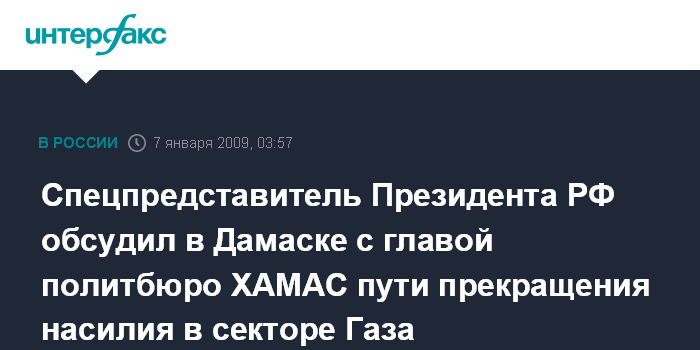 Москва. 7 января. ИНТЕРФАКС - В рамках усилий по скорейшей деэскалации кризисной ситуации вокруг сектора Газа специальный представитель Президента РФ, заместитель министра иностранных дел Александр Салтанов встретился в среду в Дамаске (Сирия) с главой политбюро ХАМАС Халедом Машаалем.