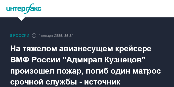 Москва. 7 января ИНТЕРФАКС-АВН - На тяжелом авианесущем крейсере РФ "Адмирал Кузнецов", который во главе группы кораблей Северного флота находится в районе совместных с Грецией учений в юго-восточном средиземноморье, вечером 6 января произошел пожар, погиб один матрос.