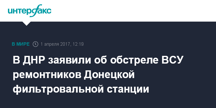 Москва. 1 апреля. INTERFAX.RU - Вооруженные силы Украины обстреляли из минометов ремонтные бригады, восстанавливающие электроснабжение Донецкой фильтровальной станции, сообщили в минобороны самопровозглашенной Донецкой народной республики (ДНР).