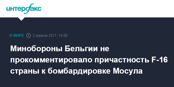 Телеканал, ссылающийся на данные журналиста The Guardian, согласно которым Пентагон подтверждает бомбардировку 17 марта в Мосуле, повлекшую гибель 140 гражданских лиц, при участии американских, французских, бельгийских и английских самолетов, отмечает, что ряд политических партий намерены потребовать срочной встречи с министром обороны в парламенте, если роль в этом инциденте истребителей F-16 Бельгии подтвердится.