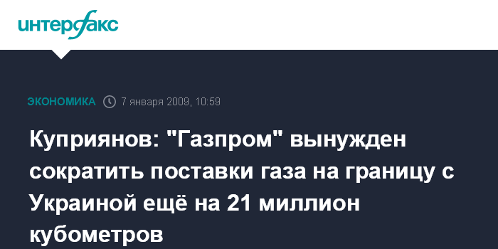 Москва. 7 января. INTERFAX.RU - "Газпром" сокращает поставки газа на российско-украинскую границу ещё на 21 миллион кубометров - именно столько топлива Киев незаконно присвоил себе за истекшие сутки, заявил в среду официальный представитель российского концерна Сергей Куприянов.