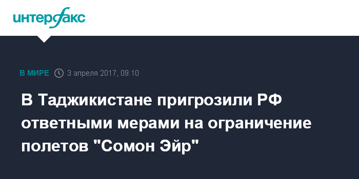 "Российская сторона с сегодняшнего дня ввела ограничения на полеты "Сомон Эйр": в понедельник, среду, пятницу запрещены четыре рейса из Душанбе и три рейса из Худжанда. Мы вынуждены принять ответные меры, и эти меры сейчас обсуждаются", - сказал собеседник агентства.