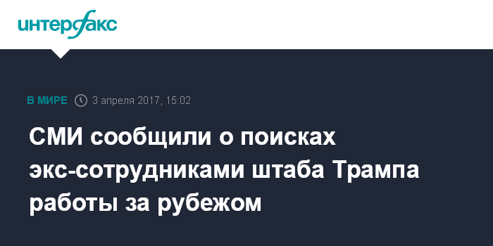Москва. 3 апреля. INTERFAX.RU - Ряд бывших сотрудников предвыборного штаба президента США Дональда Трампа в настоящее время находятся в активном поиске работы за пределами США, пишет в понедельник газета Politico.