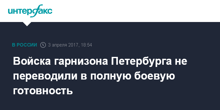 Москва. 3 апреля. INTERFAX.RU - В Западном военном округе (ЗВО) опровергли сообщения ряда СМИ о переводе войск гарнизона Санкт-Петербурга в полную готовность после взрыва в метро.