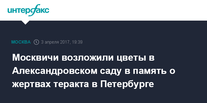 Москва. 3 апреля. INTERFAX.RU - Десятки людей пришли в Александровский сад в центре Москвы, чтобы почтить память о погибших в результате взрыва в петербургском метро, передал корреспондент "Интерфакса".