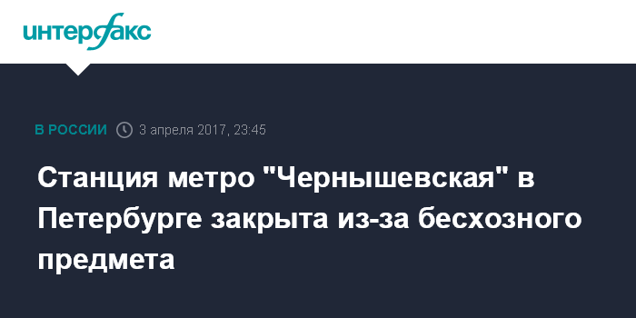 Москва. 3 апреля. INTERFAX.RU - Станция метро "Чернышевская" в Петербурге закрыта в понедельник вечером из-за обнаружения бесхозного предмета, сообщила пресс-служба городской подземки.